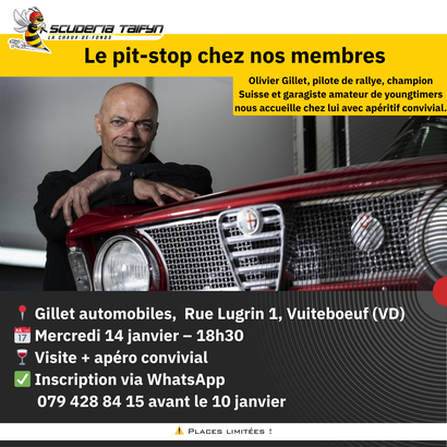 Pilote de rallye, champion de Suisse et spécialiste des youngtimers, Olivier nous ouvrira les portes de son atelier pour une visite commentée, suivie d’un apéritif convivial.